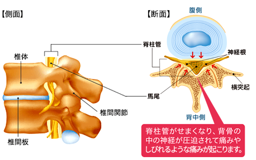 腰部脊柱管狭窄(ようぶ せきちゅうかん きょうさく)とは、文字通り、腰のあたりにある脊柱管が狭くなって神経が圧迫された状態のことで、50代を超えた中高年に多く見られる。