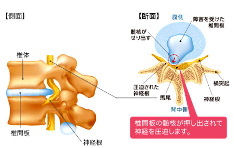 椎間板の中にはゼリー状の「髄核(ずいかく)」という部分があり、椎間板ヘルニアでは、何らかの理由でこの髄核が押し出され、脊柱管の中を通っている神経が圧迫されることで痛みやしびれるような痛みが起こる。