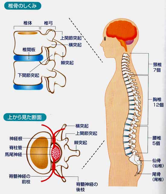 背骨は医学的には脊柱と言い、脊椎には骨(椎骨)が24個(頸椎7個、胸椎12個、腰椎5個)とその下には仙骨と尾骨が続いている。人体の骨はおよそ206個あり、そのうち屋台骨の背骨の骨は33個しかないので、大事に使いたい。
