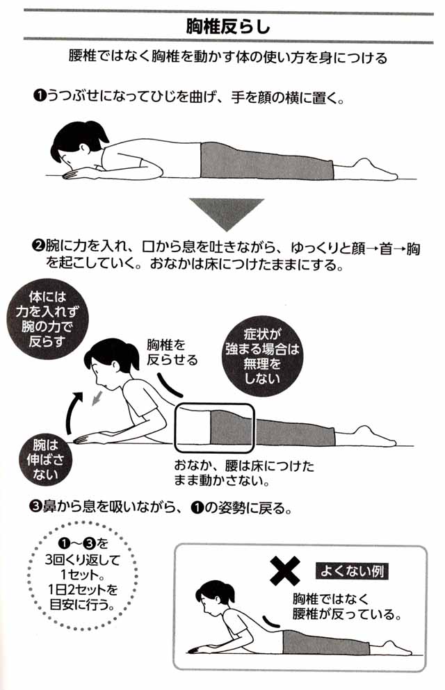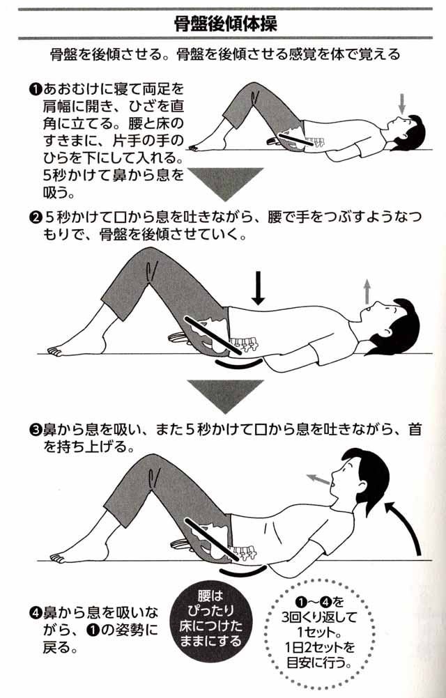 骨盤を後傾させることを重視した体操で、痛みを感じた時に行えば症状を素早く軽減させることができる。骨盤が後傾すると同時に腰椎(背骨の腰の部分)後部の椎間関節が広がり、黄色靭帯のたるみが緩んで脊柱管の狭窄が緩和される。