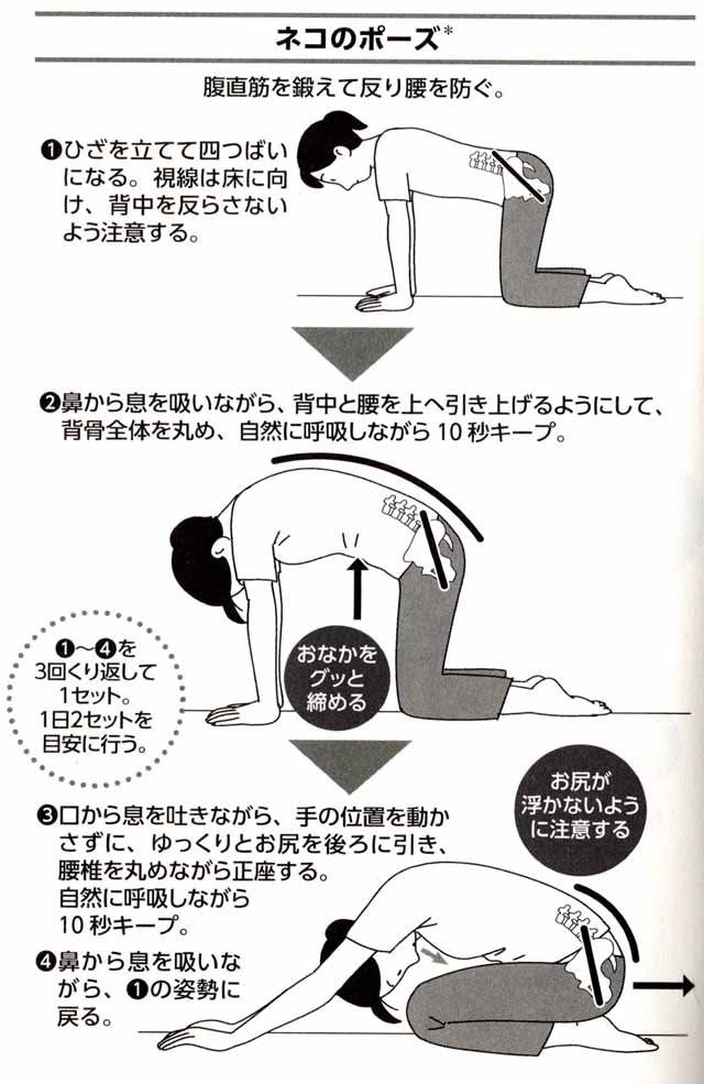 反り腰の原因となる腹直筋を鍛える。同時に腰椎後部の椎間関節を拡げる効果、腹横筋などの体幹深層筋(体の深いところにある筋肉)を鍛える効果も期待できる