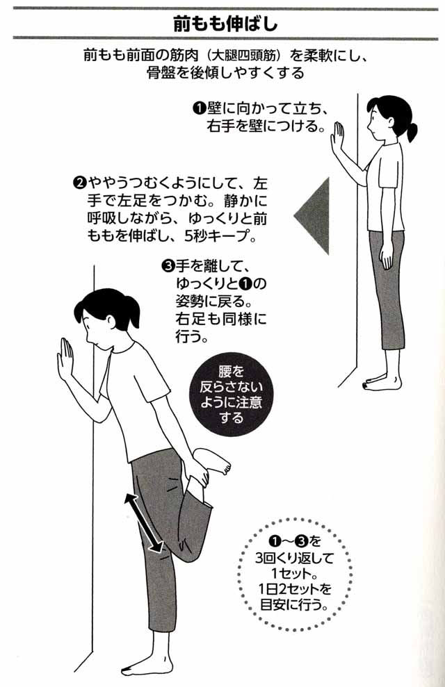 太もも前面にある大腿四頭筋が固くなっていると股関節が伸びず、骨盤を後傾できないので、ストレッチを柔軟にする体操
