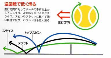 スライスとは、ラケットを上から下に振ってボールに逆回転をかけるショットだ。地面に落ちるまでの滞空時間が長く、低い軌道で飛んでゆき、バウンドしてからも高く弾まない。面の当て方によって、低く滑らせたり、止まるように失速させたりと、バウンドを変えることもできる。